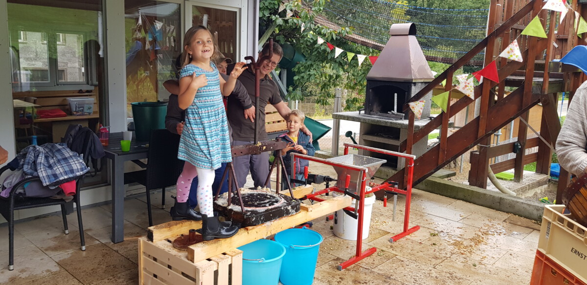 Wir haben aus gepflückten und aufgelesenen Äpfeln und Birnen unseren eigenen Most hergestellt.